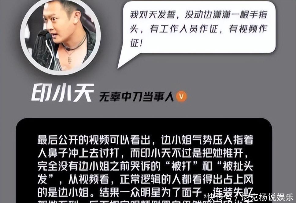 贾乃亮率先站出来,说:“我那同学都哭到泣不成声了,前辈你是不是该好好反省一下?”杜淳更热血,冲着“兄弟”大喊:“男人点,赶紧出来认错!”李晨都忍不住插一句:“相信边潇潇的性格,姑娘别难过。”一帮子人没搞清楚事实就搅和在一块。印小天作为内地新四大小生之一,竟然被硬生生地贴上了“家暴男”的标签。印小天当时急得直跺脚,不停地强调:“有视频作证,我没有动手。”可是没人相信他的说辞。
