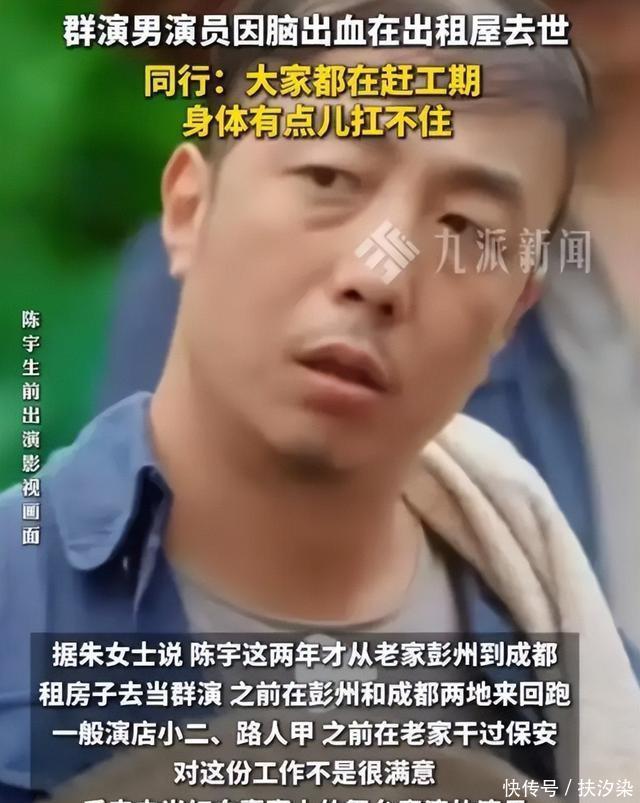 2025日,44岁男演员陈宇因脑出血在成都一间出租屋内去世。该事件在几天后通过演艺圈同行在群聊中的缅怀消息传播开来,并迅速登上网络热搜,引发广泛关注。多名媒体日报道此事,联系上陈宇的母亲朱女士以及相关同行,还原了事件经过和陈宇的生前情况。 陈宇长期从事群众演员工作,主要参与短剧、电视剧和广告中的群演角色。此前他在老家彭州从事过保安工作,后来转行参与红白喜事舞台表演,近年才开始在成都租房专职跑群演。他不挑戏份,只要有通告就接,从彭州和成都两地来回跑戏,到这两年固定在成都租房居住。11日晚,陈宇从彭州前往成都,称有戏要拍,此后便失去联系。21日后家人和同行多次拨打电话均无人接听,直日家人报警,警方进入出租屋后确认陈宇已因脑出血去世。 朱女士日从老家赶到成都处理后事,她在接受九派新闻等媒体采访时表示,陈宇生前经常熬夜看剧本和背台词到深夜,此前她曾多次建议儿子去做体检,特别是检查高血压相关项目,但陈宇总觉得自己还年轻,没有把这件事放在心上。朱女士提到,陈宇转行做群演后,工作强度较大,但收入主要靠通告数量支撑,他一直坚持在这一行努力。陈宇的联络人王小川证实,陈宇为人老实,从不挑戏,短剧、电视剧、广告都接,出事后多家剧组的演员统筹主动结清了他的演出报酬。